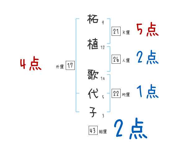 天運![]() | 柘植歌代子さんの天運は21画の5つ星!統率力がある。独立し成功する。名誉を手に入れる。 家系が持つ宿命的な運勢を表します。祖先から受け継いだ苗字ですので自分の力が及びません。家柄を象徴します。 |