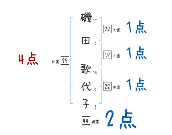 総運![]() | 磯田歌代子さんの総運は44画の2つ星!誠実で慎重な性格。物事を考えすぎないように注意しましょう。 あなたの人生を表す1番重要な運勢です。生涯を通じて影響する総合運となり、主に50歳以降の晩年期に影響を及ぼします。 |
