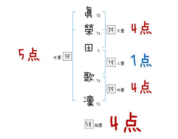 外運![]() | 眞榮田歌凜さんの外運は39画の5つ星!社交性に優れ人望が厚い。人の上に立ち成功する。 生活面を象徴する運勢です。外部から受ける影響力を表し、結婚運、家庭運や職場、環境への順応性を表します。 |