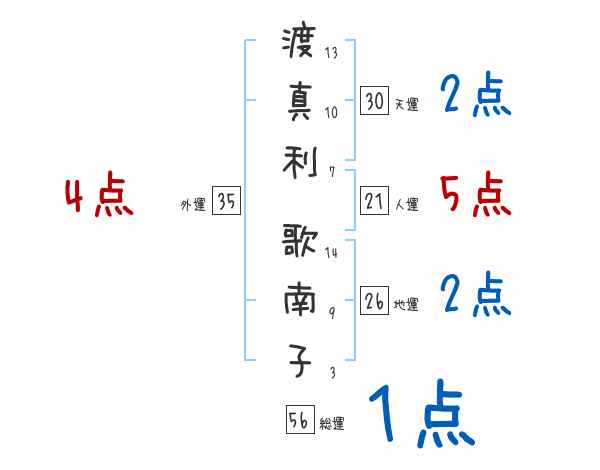 外運![]() | 渡真利歌南子さんの外運は35画の4つ星!温厚な性格で感受性が高い。穏和な性格で人望が厚い。 生活面を象徴する運勢です。外部から受ける影響力を表し、結婚運、家庭運や職場、環境への順応性を表します。 |