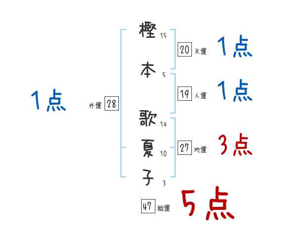 外運![]() | 樫本歌夏子さんの外運は28画の1つ星!家庭環境に注意。スポーツで活躍できる能力があるかも。 生活面を象徴する運勢です。外部から受ける影響力を表し、結婚運、家庭運や職場、環境への順応性を表します。 |