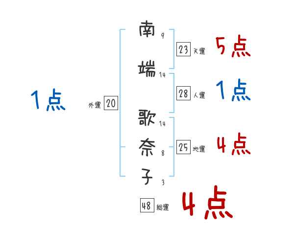 天運![]() | 南端歌奈子さんの天運は23画の5つ星!想像力に優れ活力がある。一代で成功し名誉を手に入れる。 家系が持つ宿命的な運勢を表します。祖先から受け継いだ苗字ですので自分の力が及びません。家柄を象徴します。 |