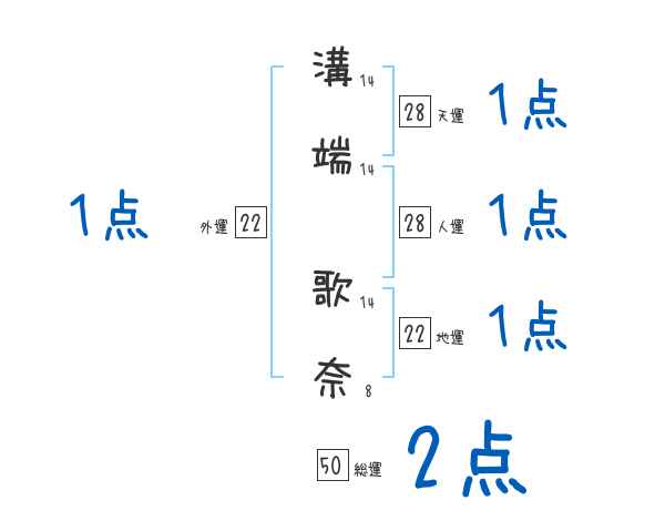 外運![]() | 溝端歌奈さんの外運は22画の1つ星!努力することが苦手ないっぽう手先が器用。芸術性にも優れる。 生活面を象徴する運勢です。外部から受ける影響力を表し、結婚運、家庭運や職場、環境への順応性を表します。 |
