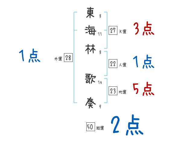 総運![]() | 東海林歌奏さんの総運は50画の2つ星!浮き沈みが激しく不安定。しりすぼみに衰退しやすいので注意しましょう。 あなたの人生を表す1番重要な運勢です。生涯を通じて影響する総合運となり、主に50歳以降の晩年期に影響を及ぼします。 |