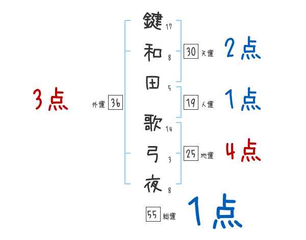 天運![]() | 鍵和田歌弓夜さんの天運は30画の2つ星!浮き沈みの激しさに注意しましょう。 家系が持つ宿命的な運勢を表します。祖先から受け継いだ苗字ですので自分の力が及びません。家柄を象徴します。 |