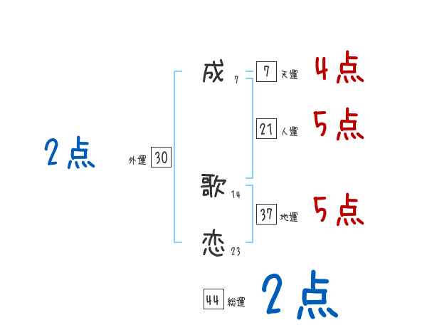 天運![]() | 成歌恋さんの天運は7画の4つ星!強い意志や信念を持ち独立心が強い。自立する。 家系が持つ宿命的な運勢を表します。祖先から受け継いだ苗字ですので自分の力が及びません。家柄を象徴します。 |