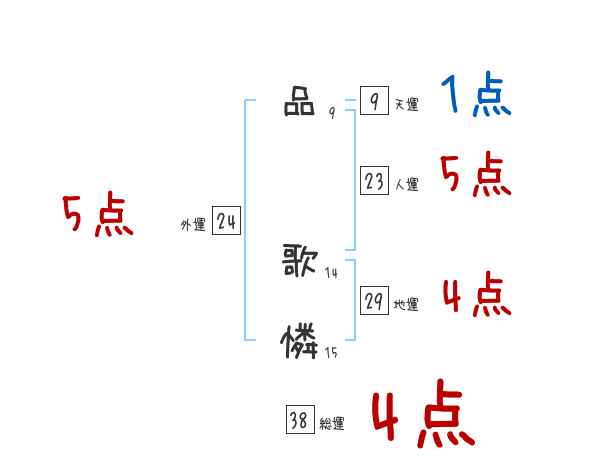 外運![]() | 品歌憐さんの外運は24画の5つ星!家庭運が良く順調な人生。金運にも恵まれる。 生活面を象徴する運勢です。外部から受ける影響力を表し、結婚運、家庭運や職場、環境への順応性を表します。 |