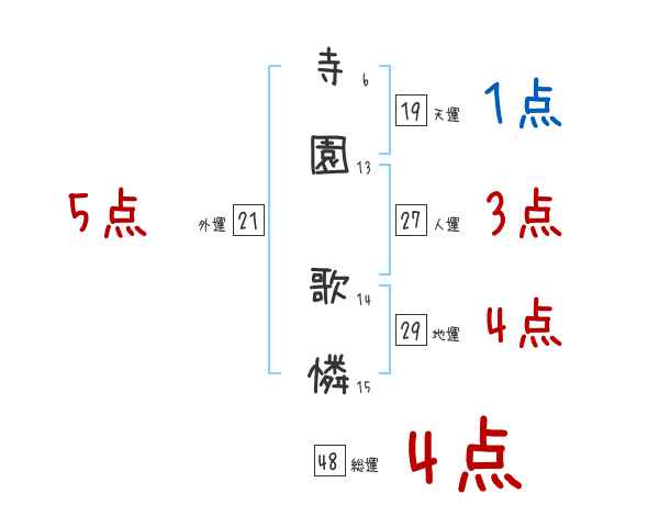天運![]() | 寺園歌憐さんの天運は19画の1つ星!優れた才能を持ちますが、協調性が足りないことも。周りの人と協力する事を意識しましょう。 家系が持つ宿命的な運勢を表します。祖先から受け継いだ苗字ですので自分の力が及びません。家柄を象徴します。 |