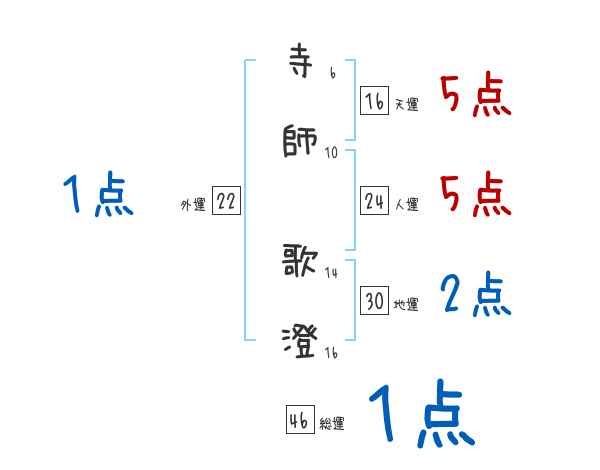 天運![]() | 寺師歌澄さんの天運は16画の5つ星!人望が厚く大きく発展する。逆転成功が見える。 家系が持つ宿命的な運勢を表します。祖先から受け継いだ苗字ですので自分の力が及びません。家柄を象徴します。 |
