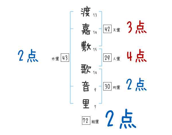 総運![]() | 渡嘉敷歌音里さんの総運は72画の2つ星!災難が多く不安定な生活にならないように注意。明暗のある人生かも。 あなたの人生を表す1番重要な運勢です。生涯を通じて影響する総合運となり、主に50歳以降の晩年期に影響を及ぼします。 |