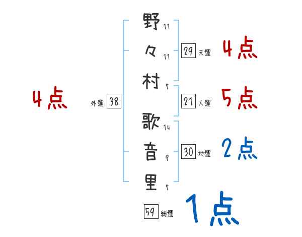 総運![]() | 野々村歌音里さんの総運は59画の1つ星!意志の弱さであきらめることが多いかも。粘り強さが必要。 あなたの人生を表す1番重要な運勢です。生涯を通じて影響する総合運となり、主に50歳以降の晩年期に影響を及ぼします。 |