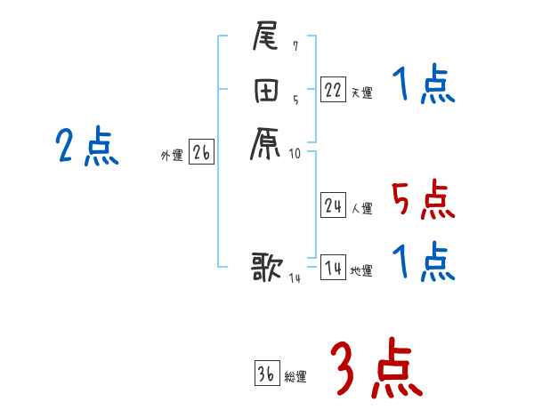 天運![]() | 尾田原歌さんの天運は22画の1つ星!努力することが苦手ないっぽう手先が器用。芸術性にも優れる。 家系が持つ宿命的な運勢を表します。祖先から受け継いだ苗字ですので自分の力が及びません。家柄を象徴します。 |