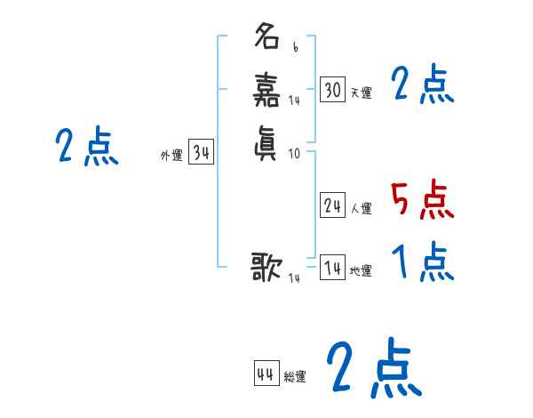 天運![]() | 名嘉眞歌さんの天運は30画の2つ星!浮き沈みの激しさに注意しましょう。 家系が持つ宿命的な運勢を表します。祖先から受け継いだ苗字ですので自分の力が及びません。家柄を象徴します。 |