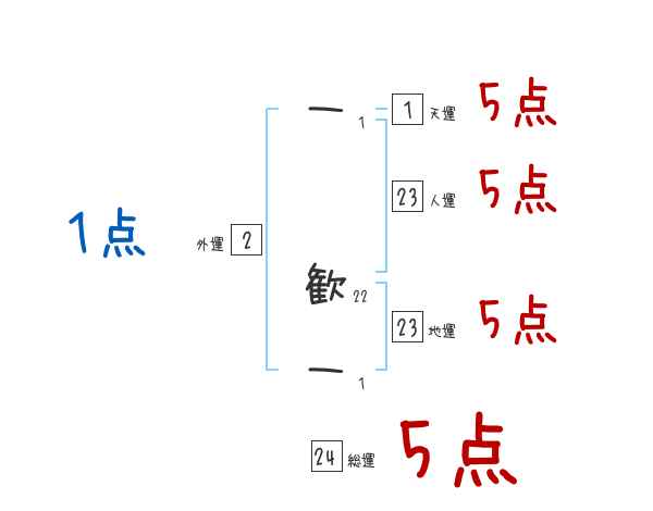 人運![]() | 一歓一さんの人運は23画の5つ星!想像力に優れ活力がある。一代で成功し名誉を手に入れる。 性格や才能などを表す2番目に重要な運勢です。人間関係や協調性、社会的な成功に影響します。主に20歳から50歳ぐらいまでの中年期の運勢を表します。 |