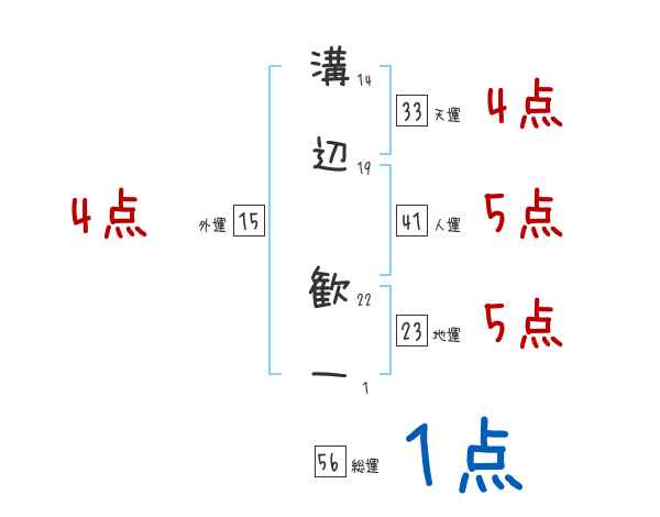 天運![]() | 溝辺歓一さんの天運は33画の4つ星!権力志向でプライドが高い。勇気があり運を切り開き成功する。 家系が持つ宿命的な運勢を表します。祖先から受け継いだ苗字ですので自分の力が及びません。家柄を象徴します。 |