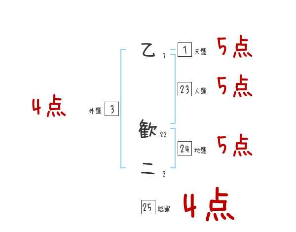 天運![]() | 乙歓二さんの天運は1画の5つ星!行動力、指導力があり出世し繁栄する。幸運に恵まれる。 家系が持つ宿命的な運勢を表します。祖先から受け継いだ苗字ですので自分の力が及びません。家柄を象徴します。 |