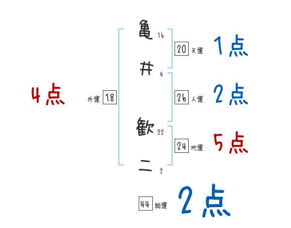 総運![]() | 亀井歓二さんの総運は44画の2つ星!誠実で慎重な性格。物事を考えすぎないように注意しましょう。 あなたの人生を表す1番重要な運勢です。生涯を通じて影響する総合運となり、主に50歳以降の晩年期に影響を及ぼします。 |