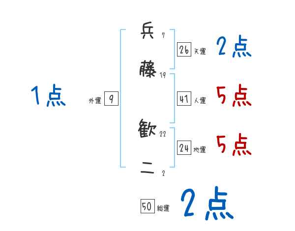 外運![]() | 兵藤歓二さんの外運は9画の1つ星!消極的で才能を発揮することが苦手なことも。周りの意見に耳を傾けましょう。 生活面を象徴する運勢です。外部から受ける影響力を表し、結婚運、家庭運や職場、環境への順応性を表します。 |