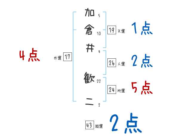 総運![]() | 加倉井歓二さんの総運は43画の2つ星!頑固な性格で独立心が強いかも。やや非現実的で浪費に注意しましょう。 あなたの人生を表す1番重要な運勢です。生涯を通じて影響する総合運となり、主に50歳以降の晩年期に影響を及ぼします。 |