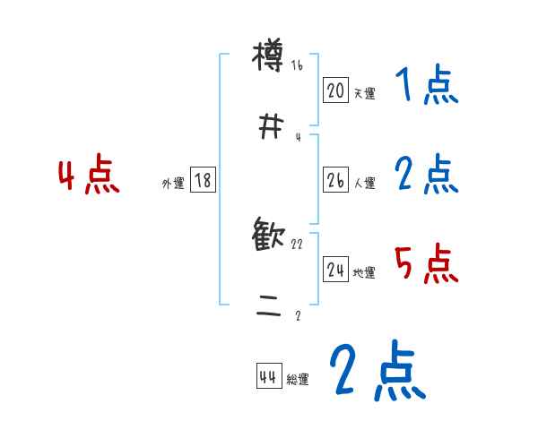 総運![]() | 樽井歓二さんの総運は44画の2つ星!誠実で慎重な性格。物事を考えすぎないように注意しましょう。 あなたの人生を表す1番重要な運勢です。生涯を通じて影響する総合運となり、主に50歳以降の晩年期に影響を及ぼします。 |