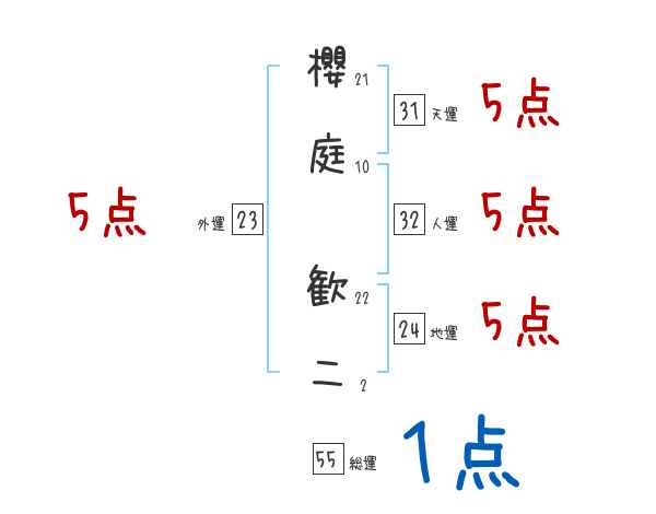 人運![]() | 櫻庭歓二さんの人運は32画の5つ星!柔軟性があり成功する。チャンスが多く金運が良い。 性格や才能などを表す2番目に重要な運勢です。人間関係や協調性、社会的な成功に影響します。主に20歳から50歳ぐらいまでの中年期の運勢を表します。 |
