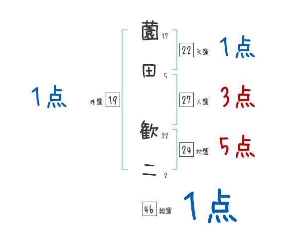 天運![]() | 薗田歓二さんの天運は22画の1つ星!努力することが苦手ないっぽう手先が器用。芸術性にも優れる。 家系が持つ宿命的な運勢を表します。祖先から受け継いだ苗字ですので自分の力が及びません。家柄を象徴します。 |