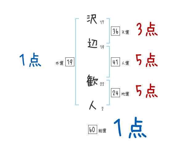 外運![]() | 沢辺歓人さんの外運は19画の1つ星!優れた才能を持ちますが、協調性が足りないことも。周りの人と協力する事を意識しましょう。 生活面を象徴する運勢です。外部から受ける影響力を表し、結婚運、家庭運や職場、環境への順応性を表します。 |