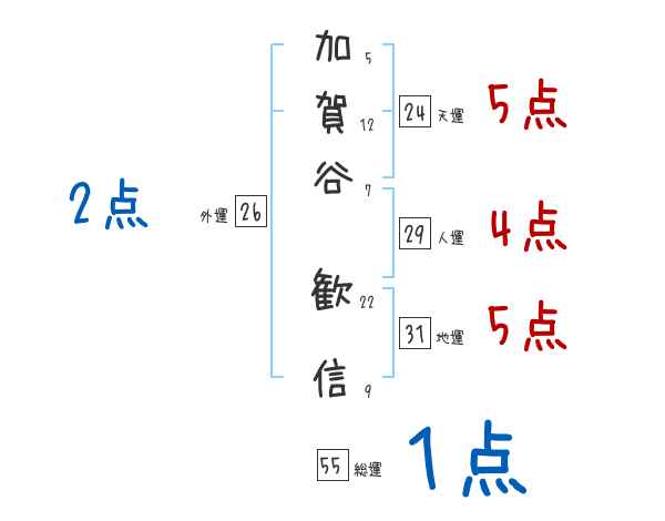 天運![]() | 加賀谷歓信さんの天運は24画の5つ星!家庭運が良く順調な人生。金運にも恵まれる。 家系が持つ宿命的な運勢を表します。祖先から受け継いだ苗字ですので自分の力が及びません。家柄を象徴します。 |
