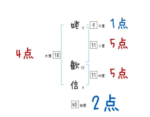天運![]() | 姥歓信さんの天運は9画の1つ星!消極的で才能を発揮することが苦手なことも。周りの意見に耳を傾けましょう。 家系が持つ宿命的な運勢を表します。祖先から受け継いだ苗字ですので自分の力が及びません。家柄を象徴します。 |