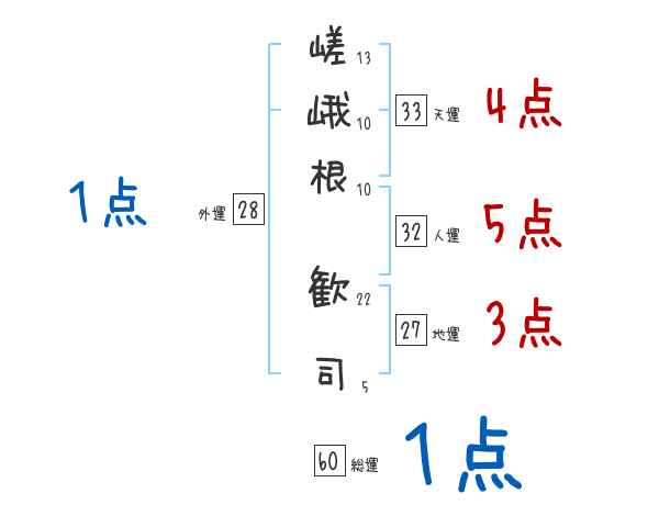 天運![]() | 嵯峨根歓司さんの天運は33画の4つ星!権力志向でプライドが高い。勇気があり運を切り開き成功する。 家系が持つ宿命的な運勢を表します。祖先から受け継いだ苗字ですので自分の力が及びません。家柄を象徴します。 |