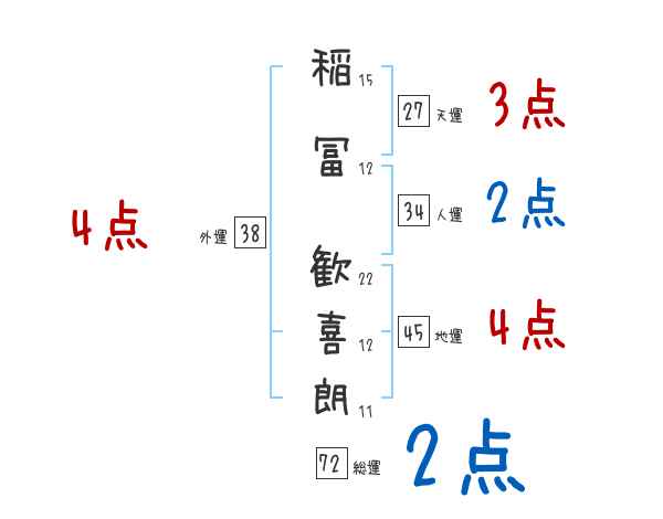外運![]() | 稲冨歓喜朗さんの外運は38画の4つ星!温厚な性格で技術的な才能を発揮する。職人的な仕事に向いている。 生活面を象徴する運勢です。外部から受ける影響力を表し、結婚運、家庭運や職場、環境への順応性を表します。 |