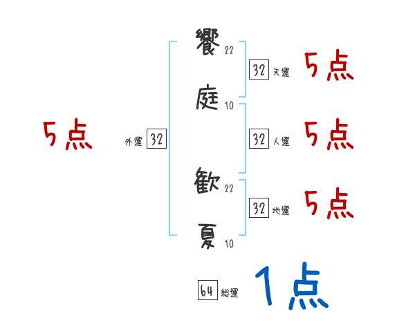 外運![]() | 饗庭歓夏さんの外運は32画の5つ星!柔軟性があり成功する。チャンスが多く金運が良い。 生活面を象徴する運勢です。外部から受ける影響力を表し、結婚運、家庭運や職場、環境への順応性を表します。 |