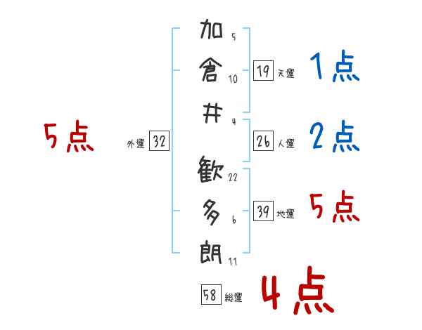 外運![]() | 加倉井歓多朗さんの外運は32画の5つ星!柔軟性があり成功する。チャンスが多く金運が良い。 生活面を象徴する運勢です。外部から受ける影響力を表し、結婚運、家庭運や職場、環境への順応性を表します。 |