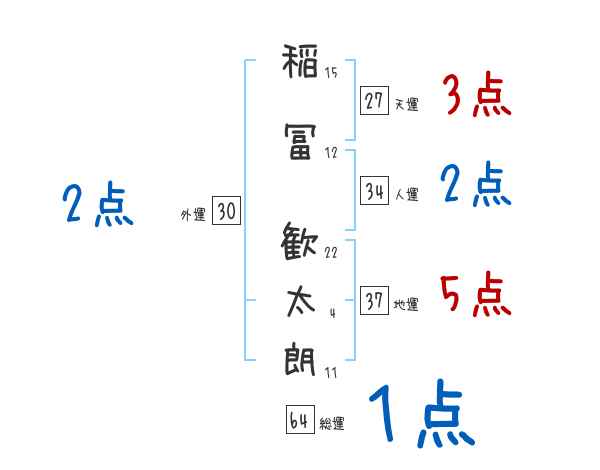天運![]() | 稲冨歓太朗さんの天運は27画の3つ星!頭脳明晰だが強情で摩擦が多い傾向。孤立に注意。 家系が持つ宿命的な運勢を表します。祖先から受け継いだ苗字ですので自分の力が及びません。家柄を象徴します。 |