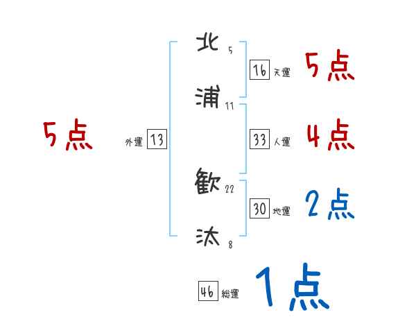 天運![]() | 北浦歓汰さんの天運は16画の5つ星!人望が厚く大きく発展する。逆転成功が見える。 家系が持つ宿命的な運勢を表します。祖先から受け継いだ苗字ですので自分の力が及びません。家柄を象徴します。 |