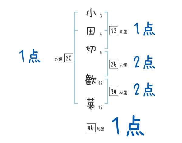 天運![]() | 小田切歓菜さんの天運は12画の1つ星!簡単な失敗で諦めてしまいやすいかも。着実に行動すると良いでしょう。 家系が持つ宿命的な運勢を表します。祖先から受け継いだ苗字ですので自分の力が及びません。家柄を象徴します。 |
