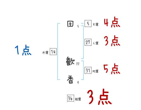 天運![]() | 田歓香さんの天運は5画の4つ星!健康で安泰。協調性に優れ、財産に恵まれる。 家系が持つ宿命的な運勢を表します。祖先から受け継いだ苗字ですので自分の力が及びません。家柄を象徴します。 |