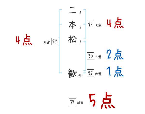 総運![]() | 二本松歓さんの総運は37画の5つ星!努力家で順応性に優れる。現実的な考え方ができ忠実に物事をこなす。 あなたの人生を表す1番重要な運勢です。生涯を通じて影響する総合運となり、主に50歳以降の晩年期に影響を及ぼします。 |