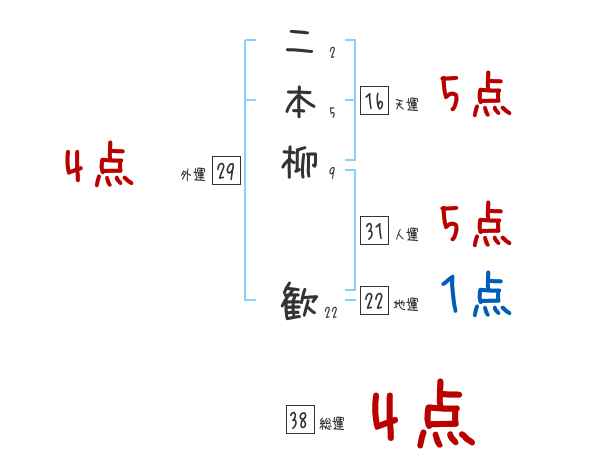 二本柳歓さんの画数の鑑定結果