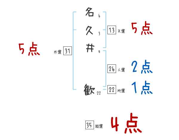 外運![]() | 名久井歓さんの外運は31画の5つ星!社交性があり判断力に優れる。順風満帆な人生で円満な生活。 生活面を象徴する運勢です。外部から受ける影響力を表し、結婚運、家庭運や職場、環境への順応性を表します。 |