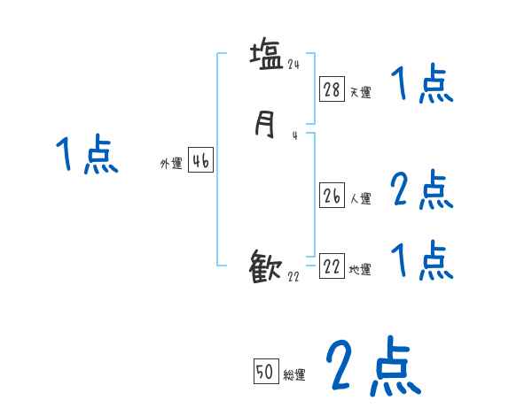 総運![]() | 塩月歓さんの総運は50画の2つ星!浮き沈みが激しく不安定。しりすぼみに衰退しやすいので注意しましょう。 あなたの人生を表す1番重要な運勢です。生涯を通じて影響する総合運となり、主に50歳以降の晩年期に影響を及ぼします。 |