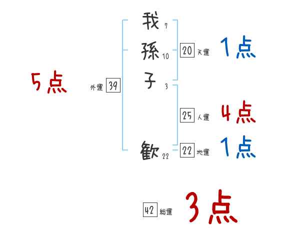 外運![]() | 我孫子歓さんの外運は39画の5つ星!社交性に優れ人望が厚い。人の上に立ち成功する。 生活面を象徴する運勢です。外部から受ける影響力を表し、結婚運、家庭運や職場、環境への順応性を表します。 |