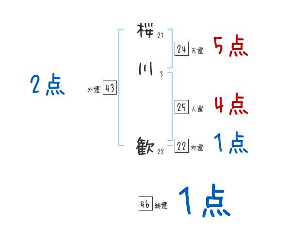 天運![]() | 桜川歓さんの天運は24画の5つ星!家庭運が良く順調な人生。金運にも恵まれる。 家系が持つ宿命的な運勢を表します。祖先から受け継いだ苗字ですので自分の力が及びません。家柄を象徴します。 |