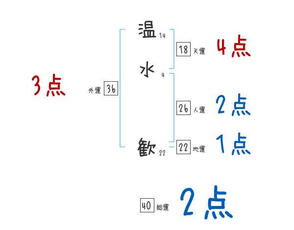 天運![]() | 温水歓さんの天運は18画の4つ星!情熱的で剛気。忍耐力があり信頼される。 家系が持つ宿命的な運勢を表します。祖先から受け継いだ苗字ですので自分の力が及びません。家柄を象徴します。 |