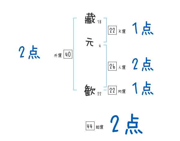 天運![]() | 藏元歓さんの天運は22画の1つ星!努力することが苦手ないっぽう手先が器用。芸術性にも優れる。 家系が持つ宿命的な運勢を表します。祖先から受け継いだ苗字ですので自分の力が及びません。家柄を象徴します。 |