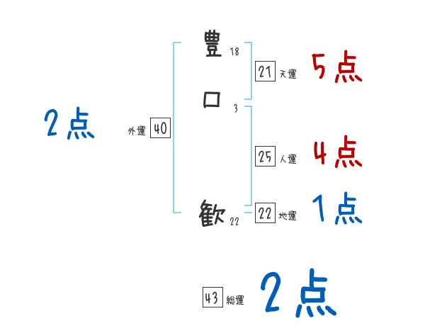 外運![]() | 豊口歓さんの外運は40画の2つ星!自信過剰で物事に固執するためトラブルに注意。 生活面を象徴する運勢です。外部から受ける影響力を表し、結婚運、家庭運や職場、環境への順応性を表します。 |