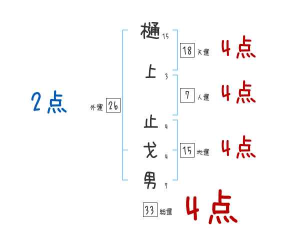 天運![]() | 樋上止戈男さんの天運は18画の4つ星!情熱的で剛気。忍耐力があり信頼される。 家系が持つ宿命的な運勢を表します。祖先から受け継いだ苗字ですので自分の力が及びません。家柄を象徴します。 |
