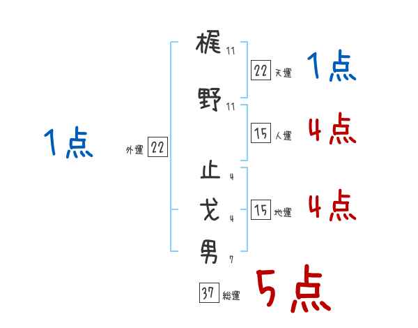 天運![]() | 梶野止戈男さんの天運は22画の1つ星!努力することが苦手ないっぽう手先が器用。芸術性にも優れる。 家系が持つ宿命的な運勢を表します。祖先から受け継いだ苗字ですので自分の力が及びません。家柄を象徴します。 |