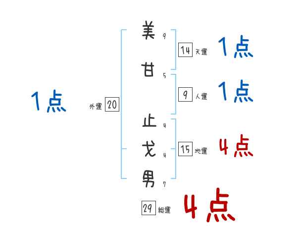 天運![]() | 美甘止戈男さんの天運は14画の1つ星!人に対して優しいがストレスを溜め込みがち。人間関係のトラブルを避けるよう気をつけましょう。 家系が持つ宿命的な運勢を表します。祖先から受け継いだ苗字ですので自分の力が及びません。家柄を象徴します。 |