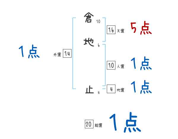 天運![]() | 倉地止さんの天運は16画の5つ星!人望が厚く大きく発展する。逆転成功が見える。 家系が持つ宿命的な運勢を表します。祖先から受け継いだ苗字ですので自分の力が及びません。家柄を象徴します。 |